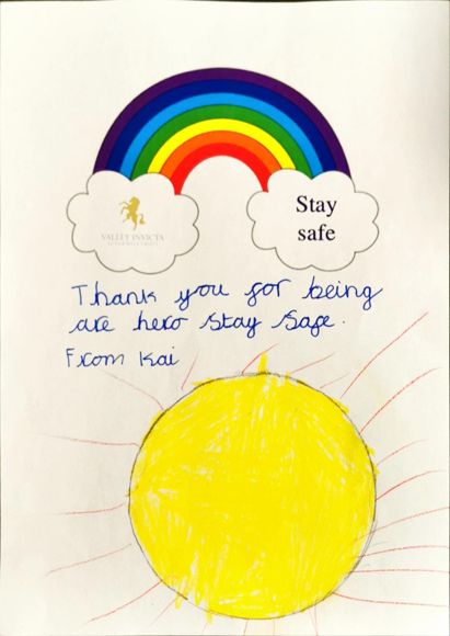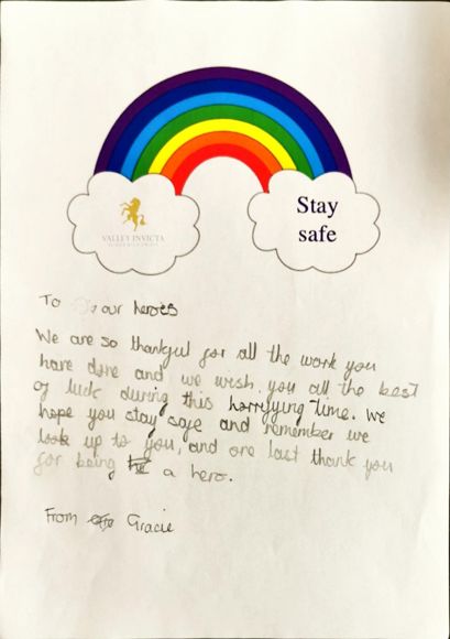 Some of the children in our hub, at Valley Invicta Primary School at East Borough, have written lovely messages to NHS staff to accompany the visors that Mr Perry and Mr Taylor have made for key workers at our local hospitals.